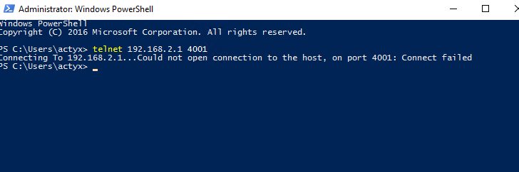 After installing telnet, you can use PowerShell or the Command Prompt to test the connection by entering the IP and port of the node you want to test the connection to. Here is an example in which connection could not be established: